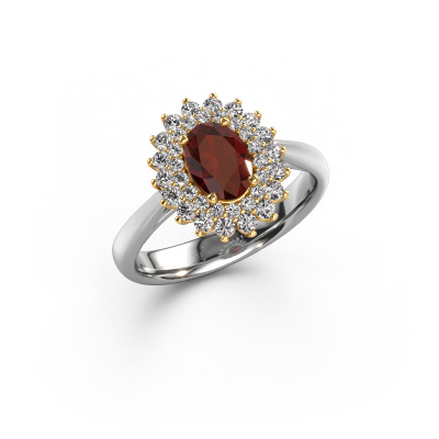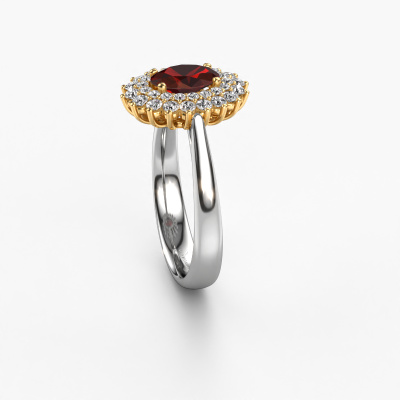 The ring shown above is called the Alina 1. We call this type of ring a cluster ring, the centre gemstone is surrounded by smaller sized stones. This 14 Carat white gold version is set with a 7x5 mm oval garnet centre stone, embraced by smaller diamonds. The classic white gold cluster engagement ring stands out because of its shape. Together, the smaller and bigger sized garnet gemstones form a flower and they appear to collide into one big sparkling gem. This classic engagement ring is also known as the flower ring. Our expert Goldsmiths make sure the smaller diamonds stones are set identically so there is no light interference in the garnet but unity instead. With perfect precision and a skilful hand each garnet is set in the ring. During manufacturing, it is constantly monitored to make sure light reflects flawlessly. This results in a unique engagement ring, with a radiant garnet at its centre. A lovely, meaningful gift to bestow upon the love of your life. Are you on a budget? Please feel free to contact us, so we can go discuss your options. We offer our engagement rings at guaranteed best price, because we make them to order. You won't find such a price anywhere else!Our designers and goldsmiths work together each day, creating new jewels. Perhaps you have found a nice classic engagement ring somewhere, which can be used to customize your unique ring. Please feel free to contact us. We will make you an offer, based on a fair price/ quality ratio, which will amaze you.To make it easier for you, we offer a 30 day return policy. Check our terms and conditions.