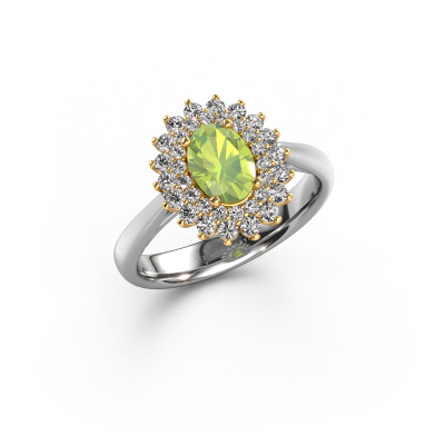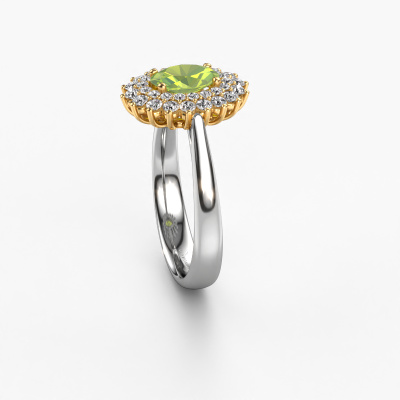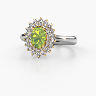 The ring shown above is called the Alina 1. We call this type of ring a cluster ring, the centre gemstone is surrounded by smaller sized stones. This 14 Carat white gold version is set with a 7x5 mm oval peridot centre stone, embraced by smaller diamonds. The classic white gold cluster engagement ring stands out because of its shape. Together, the smaller and bigger sized peridot gemstones form a flower and they appear to collide into one big sparkling gem. This classic engagement ring is also known as the flower ring. Our expert Goldsmiths make sure the smaller diamonds stones are set identically so there is no light interference in the peridot but unity instead. With perfect precision and a skilful hand each peridot is set in the ring. During manufacturing, it is constantly monitored to make sure light reflects flawlessly. This results in a unique engagement ring, with a radiant peridot at its centre. A lovely, meaningful gift to bestow upon the love of your life. Are you on a budget? Please feel free to contact us, so we can go discuss your options. We offer our engagement rings at guaranteed best price, because we make them to order. You won't find such a price anywhere else!Our designers and goldsmiths work together each day, creating new jewels. Perhaps you have found a nice classic engagement ring somewhere, which can be used to customize your unique ring. Please feel free to contact us. We will make you an offer, based on a fair price/ quality ratio, which will amaze you.To make it easier for you, we offer a 30 day return policy. Check our terms and conditions.