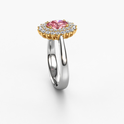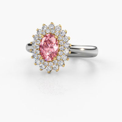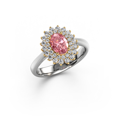 The ring shown above is called the Alina 1. We call this type of ring a cluster ring, the centre gemstone is surrounded by smaller sized stones. This 14 Carat white gold version is set with a 7x5 mm oval pink lab grown diamond centre stone, embraced by smaller diamonds. The classic white gold cluster engagement ring stands out because of its shape. Together, the smaller and bigger sized pink lab grown diamond gemstones form a flower and they appear to collide into one big sparkling gem. This classic engagement ring is also known as the flower ring. Our expert Goldsmiths make sure the smaller diamonds stones are set identically so there is no light interference in the pink lab grown diamond but unity instead. With perfect precision and a skilful hand each pink lab grown diamond is set in the ring. During manufacturing, it is constantly monitored to make sure light reflects flawlessly. This results in a unique engagement ring, with a radiant pink lab grown diamond at its centre. A lovely, meaningful gift to bestow upon the love of your life. Are you on a budget? Please feel free to contact us, so we can go discuss your options. We offer our engagement rings at guaranteed best price, because we make them to order. You won't find such a price anywhere else!Our designers and goldsmiths work together each day, creating new jewels. Perhaps you have found a nice classic engagement ring somewhere, which can be used to customize your unique ring. Please feel free to contact us. We will make you an offer, based on a fair price/ quality ratio, which will amaze you.To make it easier for you, we offer a 30 day return policy. Check our terms and conditions.