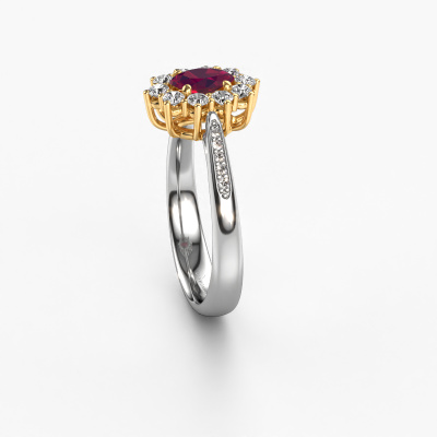 The ring shown above is called the Leesa 2. We call this type of ring a cluster ring, the centre gemstone is surrounded by smaller sized stones. This 14 Carat white gold version is set with a 6x4 mm oval rhodolite centre stone, embraced by smaller diamonds. The classic white gold cluster engagement ring stands out because of its shape. Together, the smaller and bigger sized rhodolite gemstones form a flower and they appear to collide into one big sparkling gem. This classic engagement ring is also known as the flower ring. Our expert Goldsmiths make sure the smaller diamonds stones are set identically so there is no light interference in the rhodolite but unity instead. With perfect precision and a skilful hand each rhodolite is set in the ring. During manufacturing, it is constantly monitored to make sure light reflects flawlessly. This results in a unique engagement ring, with a radiant rhodolite at its centre. A lovely, meaningful gift to bestow upon the love of your life. Are you on a budget? Please feel free to contact us, so we can go discuss your options. We offer our engagement rings at guaranteed best price, because we make them to order. You won't find such a price anywhere else!Our designers and goldsmiths work together each day, creating new jewels. Perhaps you have found a nice classic engagement ring somewhere, which can be used to customize your unique ring. Please feel free to contact us. We will make you an offer, based on a fair price/ quality ratio, which will amaze you.To make it easier for you, we offer a 30 day return policy. Check our terms and conditions.
