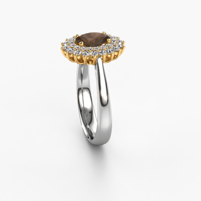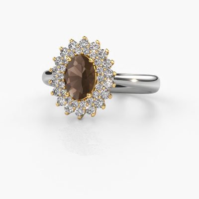 The ring shown above is called the Alina 1. We call this type of ring a cluster ring, the centre gemstone is surrounded by smaller sized stones. This 14 Carat white gold version is set with a 7x5 mm oval smokey quartz centre stone, embraced by smaller diamonds. The classic white gold cluster engagement ring stands out because of its shape. Together, the smaller and bigger sized smokey quartz gemstones form a flower and they appear to collide into one big sparkling gem. This classic engagement ring is also known as the flower ring. Our expert Goldsmiths make sure the smaller diamonds stones are set identically so there is no light interference in the smokey quartz but unity instead. With perfect precision and a skilful hand each smokey quartz is set in the ring. During manufacturing, it is constantly monitored to make sure light reflects flawlessly. This results in a unique engagement ring, with a radiant smokey quartz at its centre. A lovely, meaningful gift to bestow upon the love of your life. Are you on a budget? Please feel free to contact us, so we can go discuss your options. We offer our engagement rings at guaranteed best price, because we make them to order. You won't find such a price anywhere else!Our designers and goldsmiths work together each day, creating new jewels. Perhaps you have found a nice classic engagement ring somewhere, which can be used to customize your unique ring. Please feel free to contact us. We will make you an offer, based on a fair price/ quality ratio, which will amaze you.To make it easier for you, we offer a 30 day return policy. Check our terms and conditions.