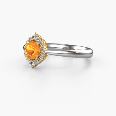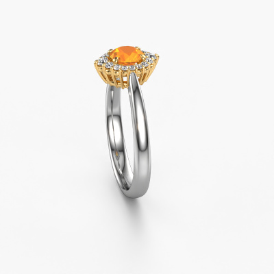 The ring shown above is called the Tora. We call this type of ring a cluster ring, the centre gemstone is surrounded by smaller sized stones. This 14 Carat white gold version is set with a 5 mm round citrin centre stone, embraced by smaller lab-grown diamonds. The classic white gold cluster engagement ring stands out because of its shape. Together, the smaller and bigger sized citrin gemstones form a flower and they appear to collide into one big sparkling gem. This classic engagement ring is also known as the flower ring. Our expert Goldsmiths make sure the smaller lab-grown diamonds stones are set identically so there is no light interference in the citrin but unity instead. With perfect precision and a skilful hand each citrin is set in the ring. During manufacturing, it is constantly monitored to make sure light reflects flawlessly. This results in a unique engagement ring, with a radiant citrin at its centre. A lovely, meaningful gift to bestow upon the love of your life. By using a combination of the latest modern techniques, combined with ancient crafting, we can make all our engagement rings in our own studio. Each jewel is made to order. This is advantageous because we can offer you a price you won't find anywhere else.Have you found a specific engagement ring somewhere which you would like to give to your loved one? Please feel free to express your wishes to our jewel designers because we would be honoured to turn your design into a classic engagement ring. You can follow the development of your ring design because we use 3D drawings. This gives you a realistic preview of how your design will look. You can also preorder a dummy. A dummy is a plastic ring, which can be shaped according your ring design. You can try it on and check if its width and size are suitable for you. We will gladly send you a non-binding offer, based on a fair price/ quality ratio. It will amaze you, considering the quality of the ring and gemstones.To make it easier for you, we offer a 30 day return policy. Check our terms and conditions.