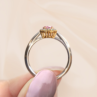 The ring shown above is called the Tora. We call this type of ring a cluster ring, the centre gemstone is surrounded by smaller sized stones. This 14 Carat white gold version is set with a 5 mm round pink lab grown diamond centre stone, embraced by smaller lab-grown diamonds. The classic white gold cluster engagement ring stands out because of its shape. Together, the smaller and bigger sized pink lab grown diamond gemstones form a flower and they appear to collide into one big sparkling gem. This classic engagement ring is also known as the flower ring. Our expert Goldsmiths make sure the smaller lab-grown diamonds stones are set identically so there is no light interference in the pink lab grown diamond but unity instead. With perfect precision and a skilful hand each pink lab grown diamond is set in the ring. During manufacturing, it is constantly monitored to make sure light reflects flawlessly. This results in a unique engagement ring, with a radiant pink lab grown diamond at its centre. A lovely, meaningful gift to bestow upon the love of your life. By using a combination of the latest modern techniques, combined with ancient crafting, we can make all our engagement rings in our own studio. Each jewel is made to order. This is advantageous because we can offer you a price you won't find anywhere else.Have you found a specific engagement ring somewhere which you would like to give to your loved one? Please feel free to express your wishes to our jewel designers because we would be honoured to turn your design into a classic engagement ring. You can follow the development of your ring design because we use 3D drawings. This gives you a realistic preview of how your design will look. You can also preorder a dummy. A dummy is a plastic ring, which can be shaped according your ring design. You can try it on and check if its width and size are suitable for you. We will gladly send you a non-binding offer, based on a fair price/ quality ratio. It will amaze you, considering the quality of the ring and gemstones.To make it easier for you, we offer a 30 day return policy. Check our terms and conditions.