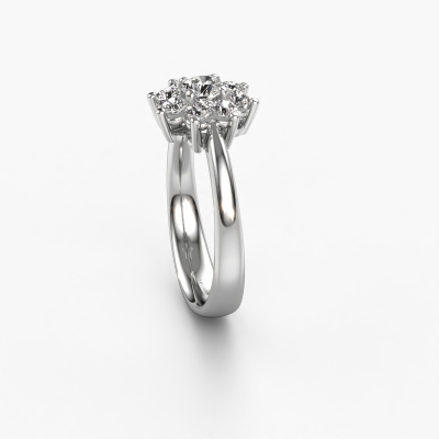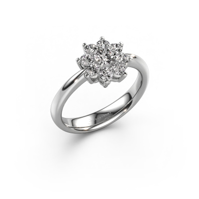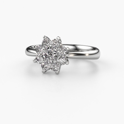 The ring shown above is called the Camille 1. We call this type of ring a cluster ring, the centre gemstone is surrounded by smaller sized stones. This 14 Carat white gold version is set with a 0.25 crt round diamond centre stone, embraced by smaller diamonds. The traditional white gold cluster engagement ring stands out because of its shape. Together, the smaller and bigger sized diamond gemstones form a flower and they appear to collide into one big sparkling gem. This traditional engagement ring is also known as the flower ring. Our expert Goldsmiths make sure the smaller diamonds stones are set identically so there is no light interference in the diamond but unity instead. With perfect precision and a skilful hand each diamond is set in the ring. During manufacturing, it is constantly monitored to make sure light reflects flawlessly. This results in a unique engagement ring, with a radiant diamond at its centre. A lovely, meaningful gift to bestow upon the love of your life. By using our modern techniques, we can design and customize the finest quality jewels with the utmost care for you. Our engagement rings are always priced 30 percent lower than other jewellers. We make engagement rings to order so we don't have to maintain a large stock. If you have a certain budget, we are more than happy to advice you accordingly.Our team adds new designs to our online collection daily. Our designers and goldsmiths work together in creating the best design. We strive to offer a diverse collection of jewels. Perhaps you have a specific jewel design in mind. One you came across somewhere. Please contact us for a free consultation. We will make you an offer, based on a fair price/ quality ratio, that will baffle you.To make it easier for you, we offer a 30 day return policy. Check our terms and conditions.