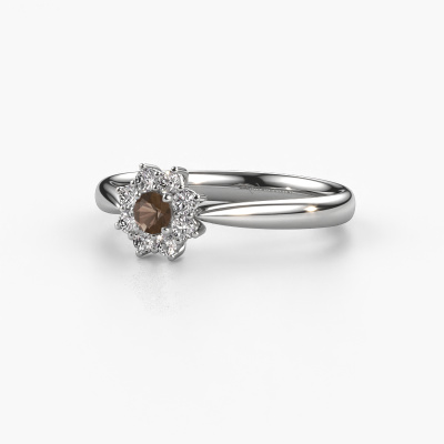 The ring shown above is called the Carolyn 1. We call this type of ring a cluster ring, the centre gemstone is surrounded by smaller sized stones. This 14 Carat white gold version is set with a 3 mm round smokey quartz centre stone, embraced by smaller diamonds. The traditional white gold cluster engagement ring stands out because of its shape. Together, the smaller and bigger sized smokey quartz gemstones form a flower and they appear to collide into one big sparkling gem. This traditional engagement ring is also known as the flower ring. Our expert Goldsmiths make sure the smaller diamonds stones are set identically so there is no light interference in the smokey quartz but unity instead. With perfect precision and a skilful hand each smokey quartz is set in the ring. During manufacturing, it is constantly monitored to make sure light reflects flawlessly. This results in a unique engagement ring, with a radiant smokey quartz at its centre. A lovely, meaningful gift to bestow upon the love of your life. By using our modern techniques, we can design and customize the finest quality jewels with the utmost care for you. Our engagement rings are always priced 30 percent lower than other jewellers. We make engagement rings to order so we don't have to maintain a large stock. If you have a certain budget, we are more than happy to advice you accordingly.Do you have a specific ring in mind? One you came across somewhere. Please feel free to tell us your wishes and we will turn your design into a unique engagement ring. You can follow the development of your ring design because we use 3D drawings. This gives you a realistic preview of your design. We will gladly send you a non-binding offer, based on a fair price/ quality ratio. It will amaze you.To make it easier for you, we offer a 30 day return policy. Check our terms and conditions.