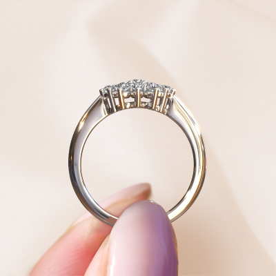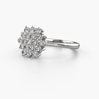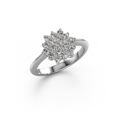 The ring shown above is called the Vickey. We call this type of ring a cluster ring, the centre gemstone is surrounded by smaller sized stones. This 14 Carat white gold version is set with a 2 mm round zirconia centre stone, embraced by smaller diamonds. The classic white gold flower engagement ring stands out because of its shape. Together, the smaller and bigger sized zirconia gemstones form a flower and they appear to collide into one big sparkling gem. This classic engagement ring is also known as the flower ring. Our expert Goldsmiths make sure the smaller diamonds stones are set identically so there is no light interference in the zirconia but unity instead. With perfect precision and a skilful hand each zirconia is set in the ring. During manufacturing, it is constantly monitored to make sure light reflects flawlessly. This results in a unique engagement ring, with a radiant zirconia at its centre. A lovely, meaningful gift to bestow upon the love of your life. Because we design and deliver our own rings, we can offer you a engagement ring at a price you won't find anywhere else. A ring is made to order, which helps prevent excess supplies, so we can make you a great price offer. We understand it feels risky, buying your engagement ring online, but we will gladly assist in the designing process, taking your budget into consideration.Our designers and goldsmiths work together each day, creating new jewels. Perhaps you have found a nice classic engagement ring somewhere, which can be used to customize your unique ring. Please feel free to contact us. We will make you an offer, based on a fair price/ quality ratio, which will amaze you.To make it easier for you, we offer a 30 day return policy. Check our terms and conditions.