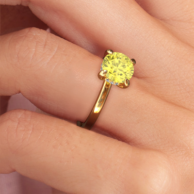 In your eyes, no one else compares to her. She is one in a million, unlike anyone else and pure? These qualities are emphasized perfectly by our exclusive gold solitaire yellow lab grown diamond ring. This yellow lab grown diamond is carefully selected by our keen artisan goldsmiths. It equals the unique qualities of the love of your life. There is no better way to memorialize your proposal than this symbol of true love. The ring shown above is called the Simone RND 2, we call this a solitaire ring because it contains a single gemstone. The engagement ring is made in 14 Carat gold and has a round yellow lab grown diamond of 7.3 mm. Each piece of jewellery is unique in every way! Simply customize to your liking,After receiving your order, our goldsmiths will passionately start the creative process of making your engagement ring in our own studio. Because we don't have a big stockpile, these costs will not be passed on to you. Our pricing is proof of that! We offer top quality jewels at lowest price, guaranteed.Our team adds new designs to our online collection daily. Our designers and goldsmiths work together in creating the best design. We strive to offer a diverse collection of jewels. Perhaps you have a specific jewel design in mind. One you came across somewhere. Please contact us for a free consultation. We will make you an offer, based on a fair price/ quality ratio, that will baffle you.To make it easier for you, we offer a 30 day return policy. Check our terms and conditions.