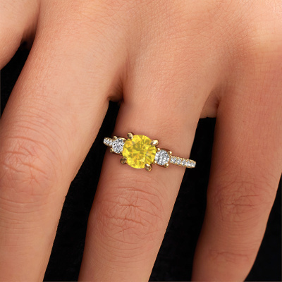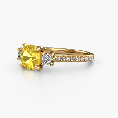 This 14 Carat gold ring is called Jesica and is set with 6.8 mm yellow sapphire. What is it that makes your relationship unique? What is it about her that makes you want to bend down on one knee? The unique bond between the two of you is emphasized by an equally unique ring. A one of a kind graceful 3-stone engagement ring made especially for her. That is why this classic ring fits her like a glove. Each specific detail of this graceful gold yellow sapphire set engagement ring is hand-picked, crafted and polished by our expert goldsmith. The result is an exquisite ring, unique and perfectly crafted to perfection. That is what our expert Goldsmiths strive for. This jewel is made just for you, with attention to detail and design.After receiving your order, our goldsmiths will passionately start the creative process of making your engagement ring in our own studio. Because we don't have a big stockpile, these costs will not be passed on to you. Our pricing is proof of that! We offer top quality jewels at lowest price, guaranteed.Different styles of new rings are made daily by our team. Perhaps you have found a 3-stone engagement ring somewhere. One you would like to give to your loved one. Please feel free to share your thoughts and design with our jewel designers. We would love to turn your design into a classic engagement ring. You can follow the development of your ring design because we use very detailed 3D drawings. On top of that, you can order a dummy of the design. A dummy is a plastic ring, which can be shaped according your ring design. You can try it on and check if the engagement ring is up to standard. We will gladly send you a non-binding offer, based on a fair price/ quality ratio. The offer will baffle you, considering the quality of the ring and gemstones.To make it easier for you, we offer a 30 day return policy. Check our terms and conditions.