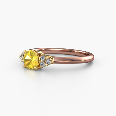 This 14 Carat rose gold ring is called Felipa RND and is set with 5 mm yellow sapphire. What is it that makes your relationship unique? What is it about her that makes you want to bend down on one knee? The unique bond between the two of you is emphasized by an equally unique ring. A one of a kind ajour 3-stone engagement ring made especially for her. That is why this fantasy ring fits her like a glove. Each specific detail of this ajour rose gold yellow sapphire set engagement ring is hand-picked, crafted and polished by our expert goldsmith. The result is an exquisite ring, unique and perfectly crafted to perfection. That is what our expert Goldsmiths strive for. This jewel is made just for you by our master goldsmiths in our own studio.After receiving your order, our goldsmiths will passionately start the creative process of making your engagement ring in our own studio. Because we don't have a big stockpile, these costs will not be passed on to you. Our pricing is proof of that! We offer top quality jewels at lowest price, guaranteed.Have you found a specific engagement ring somewhere which you would like to give to your loved one? Please feel free to express your wishes to our jewel designers because we would be honoured to turn your design into a fantasy engagement ring. You can follow the development of your ring design because we use 3D drawings. This gives you a realistic preview of how your design will look. You can also preorder a dummy. A dummy is a plastic ring, which can be shaped according your ring design. You can try it on and check if its width and size are suitable for you. We will gladly send you a non-binding offer, based on a fair price/ quality ratio. It will amaze you, considering the quality of the ring and gemstones.To make it easier for you, we offer a 30 day return policy. Check our terms and conditions.