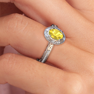 This platinum ring is called Alice OVL and is set with 7x5 mm yellow sapphire. What is it that makes your relationship unique? What is it about her that makes you want to bend down on one knee? The unique bond between the two of you is emphasized by an equally unique ring. A one of a kind filigree halo engagement ring made especially for her. That is why this vintage ring fits her like a glove. Each specific detail of this filigree platinum yellow sapphire set engagement ring is hand-picked, crafted and polished by our expert goldsmith. The result is an exquisite ring, unique and perfectly crafted to perfection. That is what our expert Goldsmiths strive for. This jewel is made with passion and love by one of our master goldsmiths.By using our modern techniques, we can design and customize the finest quality jewels with the utmost care for you. Our engagement rings are always priced 30 percent lower than other jewellers. We make engagement rings to order so we don't have to maintain a large stock. If you have a certain budget, we are more than happy to advice you accordingly.Our team adds new designs to our online collection daily. Our designers and goldsmiths work together in creating the best design. We strive to offer a diverse collection of jewels. Perhaps you have a specific jewel design in mind. One you came across somewhere. Please contact us for a free consultation. We will make you an offer, based on a fair price/ quality ratio, that will baffle you.To make it easier for you, we offer a 30 day return policy. Check our terms and conditions.