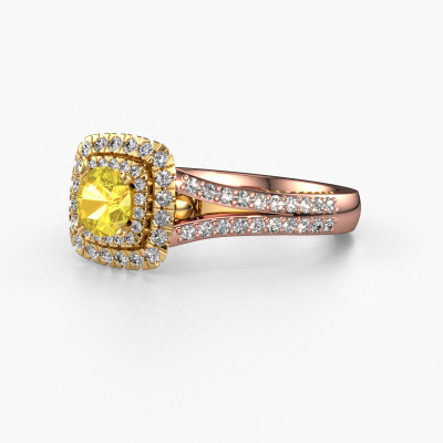 The ring shown above is called the Annette. We call this type of ring a halo ring because it has one centre gemstone and a band that is also pave set with gemstones. The 14 Carat rose gold engagement ring is set with a round 5 mm yellow sapphire centre stone and the band is pave set with diamond gemstones. Each jewel is made just for you by our master goldsmiths in our own studio.This vintage rose gold halo engagement ring has an exquisite round yellow sapphire centre stone. To further accentuate the centre stone, the band is fully set with more diamonds. Its open prong setting allows light to strike the yellow sapphire from various angles and this adds sparkle to your yellow sapphire ring. The photo shown above depicts the goldsmith's carefully handcrafted details of the ring. The high positioning of the centre stone is truly eye-catching. The perfect engagement ring for the crown jewel of your life! After receiving your order, our goldsmiths will passionately start the creative process of making your engagement ring in our own studio. Because we don't have a big stockpile, these costs will not be passed on to you. Our pricing is proof of that! We offer top quality jewels at lowest price, guaranteed.Have you found a specific engagement ring somewhere which you would like to give to your loved one? Please feel free to express your wishes to our jewel designers because we would be honoured to turn your design into a vintage engagement ring. You can follow the development of your ring design because we use 3D drawings. This gives you a realistic preview of how your design will look. You can also preorder a dummy. A dummy is a plastic ring, which can be shaped according your ring design. You can try it on and check if its width and size are suitable for you. We will gladly send you a non-binding offer, based on a fair price/ quality ratio. It will amaze you, considering the quality of the ring and gemstones.To make it easier for you, we offer a 30 day return policy. Check our terms and conditions.