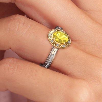 This 14 Carat white gold ring is called Alice OVL and is set with 7x5 mm yellow sapphire. What is it that makes your relationship unique? What is it about her that makes you want to bend down on one knee? The unique bond between the two of you is emphasized by an equally unique ring. A one of a kind filigree halo engagement ring made especially for her. That is why this vintage ring fits her like a glove. Each specific detail of this filigree white gold yellow sapphire set engagement ring is hand-picked, crafted and polished by our expert goldsmith. The result is an exquisite ring, unique and perfectly crafted to perfection. That is what our expert Goldsmiths strive for. This jewel is made with passion and love by one of our master goldsmiths.By using our modern techniques, we can design and customize the finest quality jewels with the utmost care for you. Our engagement rings are always priced 30 percent lower than other jewellers. We make engagement rings to order so we don't have to maintain a large stock. If you have a certain budget, we are more than happy to advice you accordingly.Our team adds new designs to our online collection daily. Our designers and goldsmiths work together in creating the best design. We strive to offer a diverse collection of jewels. Perhaps you have a specific jewel design in mind. One you came across somewhere. Please contact us for a free consultation. We will make you an offer, based on a fair price/ quality ratio, that will baffle you.To make it easier for you, we offer a 30 day return policy. Check our terms and conditions.