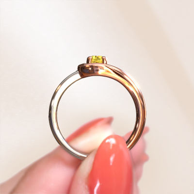 The ring shown above is called the Ceylin, we call this a solitaire ring because it contains a single gemstone. The engagement ring is made in 14 Carat rose gold and has a round yellow sapphire of 4 mm. The cool thing about our configurator is that you can compile your own piece of jewellery, into a completely personalized one. This solitaire ring is crafted in the precious metals rose gold with white gold, but of course you are free to pick your own colours. Each piece of jewellery is unique in every way! Simply customize to your liking,The solitaire ring is a special type of engagement ring. Its open prong setting allows light to strike the gemstone from various angles. This fantasy engagement ring is a stunning eye-catcher because of the high positioning of the gemstone. In order for you to commemorate your proposal with a unique ring, we carefully adorn this solitaire ring by hand. The love of your life deserves nothing but the best. Are you on a budget? Please feel free to contact us, so we can go discuss your options. We offer our engagement rings at guaranteed best price, because we make them to order. You won't find such a price anywhere else!Have you found a specific engagement ring somewhere which you would like to give to your loved one? Please feel free to express your wishes to our jewel designers because we would be honoured to turn your design into a fantasy engagement ring. You can follow the development of your ring design because we use 3D drawings. This gives you a realistic preview of how your design will look. You can also preorder a dummy. A dummy is a plastic ring, which can be shaped according your ring design. You can try it on and check if its width and size are suitable for you. We will gladly send you a non-binding offer, based on a fair price/ quality ratio. It will amaze you, considering the quality of the ring and gemstones.To make it easier for you, we offer a 30 day return policy. Check our terms and conditions.