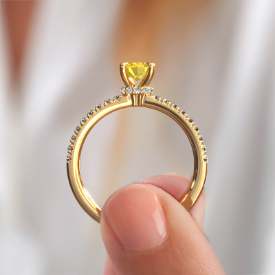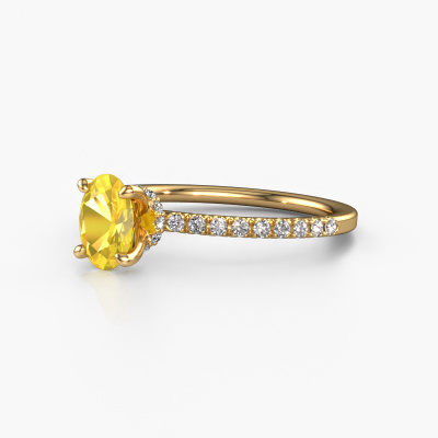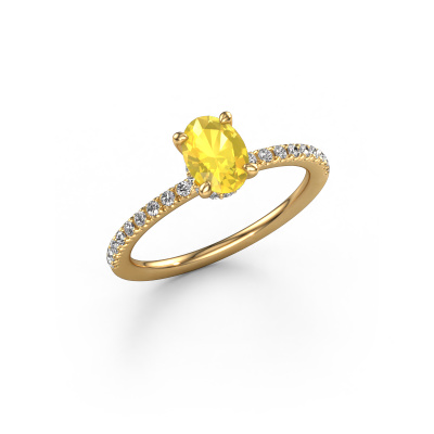 The ring shown above is called the Crystal OVL 4. We call this type of ring a pavé solitaire ring because it has one centre gemstone and a band that is also pave set with gemstones. The 14 Carat gold engagement ring is set with a oval 7x5 mm yellow sapphire centre stone and the band is pave set with diamond gemstones. Each jewel is made with passion and love by one of our master goldsmiths.This contemporary gold pavé solitaire engagement ring has an exquisite oval yellow sapphire centre stone. To further accentuate the centre stone, the band is fully set with more diamonds. Its open prong setting allows light to strike the yellow sapphire from various angles and this adds sparkle to your yellow sapphire ring. The photo shown above depicts the goldsmith's carefully handcrafted details of the ring. The high positioning of the centre stone is truly eye-catching. The perfect engagement ring for the crown jewel of your life! After receiving your order, our goldsmiths will passionately start the creative process of making your engagement ring in our own studio. Because we don't have a big stockpile, these costs will not be passed on to you. Our pricing is proof of that! We offer top quality jewels at lowest price, guaranteed.Our team adds new designs to our online collection daily. Our designers and goldsmiths work together in creating the best design. We strive to offer a diverse collection of jewels. Perhaps you have a specific jewel design in mind. One you came across somewhere. Please contact us for a free consultation. We will make you an offer, based on a fair price/ quality ratio, that will baffle you.To make it easier for you, we offer a 30 day return policy. Check our terms and conditions.