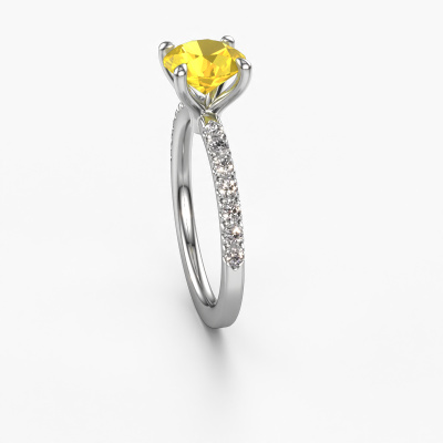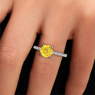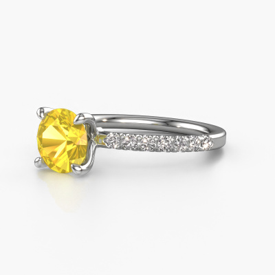 The ring shown above is called the Crystal RND 2. We call this type of ring a pavé solitaire ring because it has one centre gemstone and a band that is also pave set with gemstones. The platinum engagement ring is set with a round 7.3 mm yellow sapphire centre stone and the band is pave set with lab grown diamond gemstones. Each jewel is unique in every way! Simply customize to your liking,This classic platinum pavé solitaire engagement ring has an exquisite round yellow sapphire centre stone. To further accentuate the centre stone, the band is fully set with more lab-grown diamonds. Its open prong setting allows light to strike the yellow sapphire from various angles and this adds sparkle to your yellow sapphire ring. The photo shown above depicts the goldsmith's carefully handcrafted details of the ring. The high positioning of the centre stone is truly eye-catching. The perfect engagement ring for the crown jewel of your life! After receiving your order, our goldsmiths will start the creative process of making your Crystal RND 2 engagement ring. We don't keep stock. This is advantageous because these costs will not be passed on to you. Therefore, we can offer jewellery at exceptionally low prices.Different styles of new rings are made daily by our team. Perhaps you have found a pavé solitaire engagement ring somewhere. One you would like to give to your loved one. Please feel free to share your thoughts and design with our jewel designers. We would love to turn your design into a classic engagement ring. You can follow the development of your ring design because we use very detailed 3D drawings. On top of that, you can order a dummy of the design. A dummy is a plastic ring, which can be shaped according your ring design. You can try it on and check if the engagement ring is up to standard. We will gladly send you a non-binding offer, based on a fair price/ quality ratio. The offer will baffle you, considering the quality of the ring and gemstones.To make it easier for you, we offer a 30 day return policy. Check our terms and conditions.