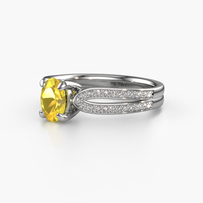 The ring shown above is called the Antonia ovl 2. We call this type of ring a pavé solitaire ring because it has one centre gemstone and a band that is also pave set with gemstones. The platinum engagement ring is set with a oval 7x5 mm yellow sapphire centre stone and the band is pave set with diamond gemstones. Each jewel is unique in every way! Simply customize to your liking,This contemporary platinum pavé solitaire engagement ring has an exquisite oval yellow sapphire centre stone. To further accentuate the centre stone, the band is fully set with more diamonds. Its open prong setting allows light to strike the yellow sapphire from various angles and this adds sparkle to your yellow sapphire ring. The photo shown above depicts the goldsmith's carefully handcrafted details of the ring. The high positioning of the centre stone is truly eye-catching. The perfect engagement ring for the crown jewel of your life! By using a combination of the latest modern techniques, combined with ancient crafting, we can make all our engagement rings in our own studio. Each jewel is made to order. This is advantageous because we can offer you a price you won't find anywhere else.Our team adds new designs to our online collection daily. Our designers and goldsmiths work together in creating the best design. We strive to offer a diverse collection of jewels. Perhaps you have a specific jewel design in mind. One you came across somewhere. Please contact us for a free consultation. We will make you an offer, based on a fair price/ quality ratio, that will baffle you.To make it easier for you, we offer a 30 day return policy. Check our terms and conditions.