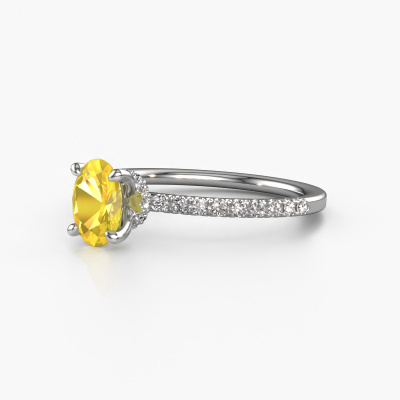The ring shown above is called the Crystal OVL 4. We call this type of ring a pavé solitaire ring because it has one centre gemstone and a band that is also pave set with gemstones. The platinum engagement ring is set with a oval 7x5 mm yellow sapphire centre stone and the band is pave set with diamond gemstones. Each jewel is made with passion and love by one of our master goldsmiths.This contemporary platinum pavé solitaire engagement ring has an exquisite oval yellow sapphire centre stone. To further accentuate the centre stone, the band is fully set with more diamonds. Its open prong setting allows light to strike the yellow sapphire from various angles and this adds sparkle to your yellow sapphire ring. The photo shown above depicts the goldsmith's carefully handcrafted details of the ring. The high positioning of the centre stone is truly eye-catching. The perfect engagement ring for the crown jewel of your life! After receiving your order, our goldsmiths will passionately start the creative process of making your engagement ring in our own studio. Because we don't have a big stockpile, these costs will not be passed on to you. Our pricing is proof of that! We offer top quality jewels at lowest price, guaranteed.Our team adds new designs to our online collection daily. Our designers and goldsmiths work together in creating the best design. We strive to offer a diverse collection of jewels. Perhaps you have a specific jewel design in mind. One you came across somewhere. Please contact us for a free consultation. We will make you an offer, based on a fair price/ quality ratio, that will baffle you.To make it easier for you, we offer a 30 day return policy. Check our terms and conditions.