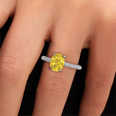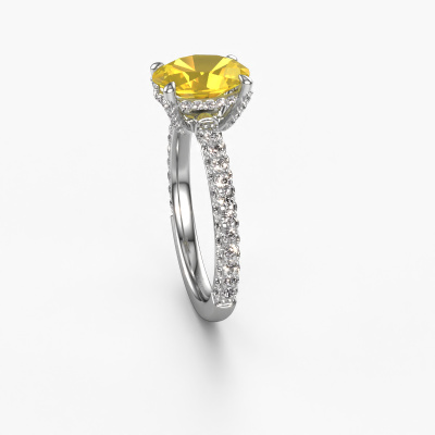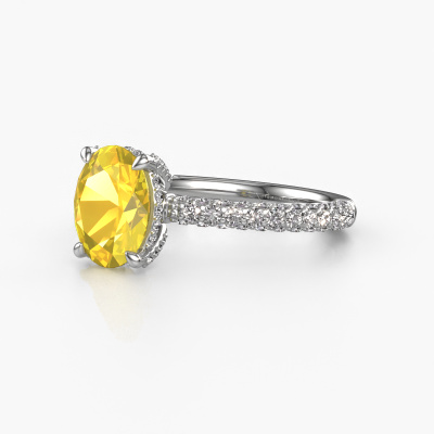 The ring shown above is called the Saskia 2 ovl. We call this type of ring a pavé solitaire ring because it has one centre gemstone and a band that is also pave set with gemstones. The platinum engagement ring is set with a oval 9x7 mm yellow sapphire centre stone and the band is pave set with lab grown diamond gemstones. Each jewel is made just for you by our master goldsmiths in our own studio.This exclusive platinum pavé solitaire engagement ring has an exquisite oval yellow sapphire centre stone. To further accentuate the centre stone, the band is fully set with more lab-grown diamonds. Its open prong setting allows light to strike the yellow sapphire from various angles and this adds sparkle to your yellow sapphire ring. The photo shown above depicts the goldsmith's carefully handcrafted details of the ring. The high positioning of the centre stone is truly eye-catching. The perfect engagement ring for the crown jewel of your life! After receiving your order, our goldsmiths will passionately start the creative process of making your engagement ring in our own studio. Because we don't have a big stockpile, these costs will not be passed on to you. Our pricing is proof of that! We offer top quality jewels at lowest price, guaranteed.Have you found a specific engagement ring somewhere which you would like to give to your loved one? Please feel free to express your wishes to our jewel designers because we would be honoured to turn your design into a exclusive engagement ring. You can follow the development of your ring design because we use 3D drawings. This gives you a realistic preview of how your design will look. You can also preorder a dummy. A dummy is a plastic ring, which can be shaped according your ring design. You can try it on and check if its width and size are suitable for you. We will gladly send you a non-binding offer, based on a fair price/ quality ratio. It will amaze you, considering the quality of the ring and gemstones.To make it easier for you, we offer a 30 day return policy. Check our terms and conditions.