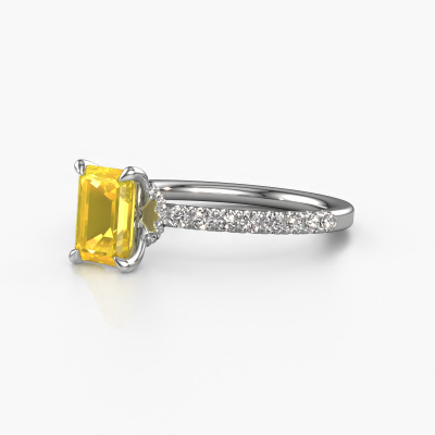 The ring shown above is called the Crystal EME 4. We call this type of ring a pavé solitaire ring because it has one centre gemstone and a band that is also pave set with gemstones. The platinum engagement ring is set with a emerald cut 7x5 mm yellow sapphire centre stone and the band is pave set with lab grown diamond gemstones. Each jewel is created to add sparkle to your finger, each jewel is lovingly made by hand by our goldsmiths.This fashionable platinum pavé solitaire engagement ring has an exquisite emerald cut yellow sapphire centre stone. To further accentuate the centre stone, the band is fully set with more lab-grown diamonds. Its open prong setting allows light to strike the yellow sapphire from various angles and this adds sparkle to your yellow sapphire ring. The photo shown above depicts the goldsmith's carefully handcrafted details of the ring. The high positioning of the centre stone is truly eye-catching. The perfect engagement ring for the crown jewel of your life! After receiving your order, our goldsmiths will passionately start the creative process of making your engagement ring in our own studio. Because we don't have a big stockpile, these costs will not be passed on to you. Our pricing is proof of that! We offer top quality jewels at lowest price, guaranteed.Our team adds new designs to our online collection daily. Our designers and goldsmiths work together in creating the best design. We strive to offer a diverse collection of jewels. Perhaps you have a specific jewel design in mind. One you came across somewhere. Please contact us for a free consultation. We will make you an offer, based on a fair price/ quality ratio, that will baffle you.To make it easier for you, we offer a 30 day return policy. Check our terms and conditions.