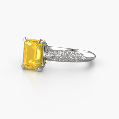 The ring shown above is called the Morane EME. We call this type of ring a pavé solitaire ring because it has one centre gemstone and a band that is also pave set with gemstones. The platinum engagement ring is set with a emerald cut 8x6 mm yellow sapphire centre stone and the band is pave set with lab grown diamond gemstones. Each jewel is made just for you by our master goldsmiths in our own studio.This unique platinum pavé solitaire engagement ring has an exquisite emerald cut yellow sapphire centre stone. To further accentuate the centre stone, the band is fully set with more lab-grown diamonds. Its open prong setting allows light to strike the yellow sapphire from various angles and this adds sparkle to your yellow sapphire ring. The photo shown above depicts the goldsmith's carefully handcrafted details of the ring. The high positioning of the centre stone is truly eye-catching. The perfect engagement ring for the crown jewel of your life! After receiving your order, our goldsmiths will passionately start the creative process of making your engagement ring in our own studio. Because we don't have a big stockpile, these costs will not be passed on to you. Our pricing is proof of that! We offer top quality jewels at lowest price, guaranteed.Our team adds new designs to our online collection daily. Our designers and goldsmiths work together in creating the best design. We strive to offer a diverse collection of jewels. Perhaps you have a specific jewel design in mind. One you came across somewhere. Please contact us for a free consultation. We will make you an offer, based on a fair price/ quality ratio, that will baffle you.To make it easier for you, we offer a 30 day return policy. Check our terms and conditions.