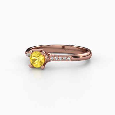 The ring shown above is called the Isa 2. We call this type of ring a pavé solitaire ring because it has one centre gemstone and a band that is also pave set with gemstones. This engagement ring is made in 14 Carat rose gold set with a 4.2 mm round yellow sapphire, and pave set diamonds at the sides. Each piece of jewellery is created to add sparkle to your finger, each jewel is lovingly made by hand by our goldsmiths.This classic rose gold pavé solitaire engagement ring has an exquisite round yellow sapphire centre stone. To further accentuate the centre stone, the band is set full with more diamonds. Its open prong setting allows light to strike the yellow sapphire from various angles and this adds sparkle to your yellow sapphire ring. The photo shown above depicts the goldsmith's carefully handcrafted details of the ring. The high positioning of the centre stone is truly eye-catching. The perfect engagement ring for the crown jewel of your life!After receiving your order, our goldsmiths will passionately start the creative process of making your engagement ring in our own studio. Because we don't have a big stockpile, these costs will not be passed on to you. Our pricing is proof of that! We offer top quality jewels at lowest price, guaranteed.Different styles of new rings are made daily by our team. Perhaps you have found a pavé solitaire engagement ring somewhere. One you would like to give to your loved one. Please feel free to share your thoughts and design with our jewel designers. We would love to turn your design into a classic engagement ring. You can follow the development of your ring design because we use very detailed 3D drawings. On top of that, you can order a dummy of the design. A dummy is a plastic ring, which can be shaped according your ring design. You can try it on and check if the engagement ring is up to standard. We will gladly send you a non-binding offer, based on a fair price/ quality ratio. The offer will baffle you, considering the quality of the ring and gemstones.To make it easier for you, we offer a 30 day return policy. Check our terms and conditions.
