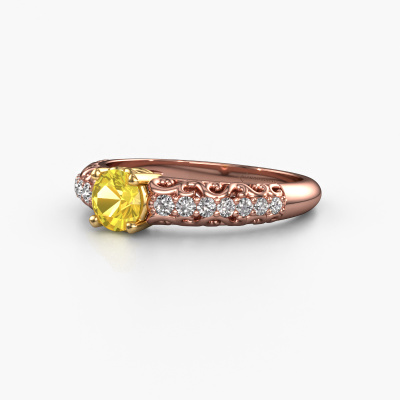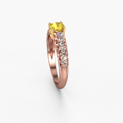 This 14 Carat rose gold ring is called Mellie and is set with 5 mm yellow sapphire. What is it that makes your relationship unique? What is it about her that makes you want to bend down on one knee? The unique bond between the two of you is emphasized by an equally unique ring. A one of a kind filigree pavé solitaire engagement ring made especially for her. That is why this vintage ring fits her like a glove. Each specific detail of this filigree rose gold yellow sapphire set engagement ring is hand-picked, crafted and polished by our expert goldsmith. The result is an exquisite ring, unique and perfectly crafted to perfection. That is what our expert Goldsmiths strive for. This jewel is made by a team of passionate goldsmiths and jewel designers. This will make your crown jewel truly eye-catching.Are you on a budget? Please feel free to contact us, so we can go discuss your options. We offer our engagement rings at guaranteed best price, because we make them to order. You won't find such a price anywhere else!Have you found a specific engagement ring somewhere which you would like to give to your loved one? Please feel free to express your wishes to our jewel designers because we would be honoured to turn your design into a vintage engagement ring. You can follow the development of your ring design because we use 3D drawings. This gives you a realistic preview of how your design will look. You can also preorder a dummy. A dummy is a plastic ring, which can be shaped according your ring design. You can try it on and check if its width and size are suitable for you. We will gladly send you a non-binding offer, based on a fair price/ quality ratio. It will amaze you, considering the quality of the ring and gemstones.To make it easier for you, we offer a 30 day return policy. Check our terms and conditions.