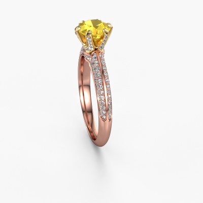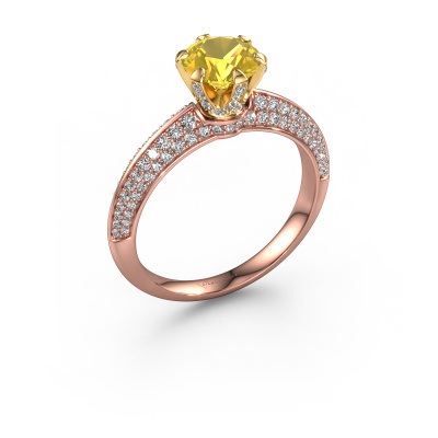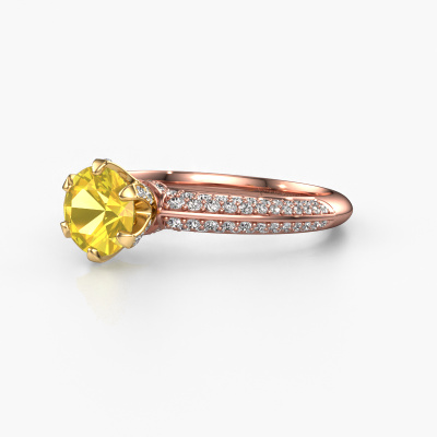The ring shown above is called the Abby. We call this type of ring a pavé solitaire ring because it has one centre gemstone and a band that is also pave set with gemstones. The 14 Carat rose gold engagement ring is set with a round 6.5 mm yellow sapphire centre stone and the band is pave set with diamond gemstones. Each jewel is made just for you by our master goldsmiths in our own studio.This exclusive rose gold pavé solitaire engagement ring has an exquisite round yellow sapphire centre stone. To further accentuate the centre stone, the band is fully set with more diamonds. Its open prong setting allows light to strike the yellow sapphire from various angles and this adds sparkle to your yellow sapphire ring. The photo shown above depicts the goldsmith's carefully handcrafted details of the ring. The high positioning of the centre stone is truly eye-catching. The perfect engagement ring for the crown jewel of your life! Are you on a budget? Please feel free to contact us, so we can go discuss your options. We offer our engagement rings at guaranteed best price, because we make them to order. You won't find such a price anywhere else!Our team adds new designs to our online collection daily. Our designers and goldsmiths work together in creating the best design. We strive to offer a diverse collection of jewels. Perhaps you have a specific jewel design in mind. One you came across somewhere. Please contact us for a free consultation. We will make you an offer, based on a fair price/ quality ratio, that will baffle you.To make it easier for you, we offer a 30 day return policy. Check our terms and conditions.