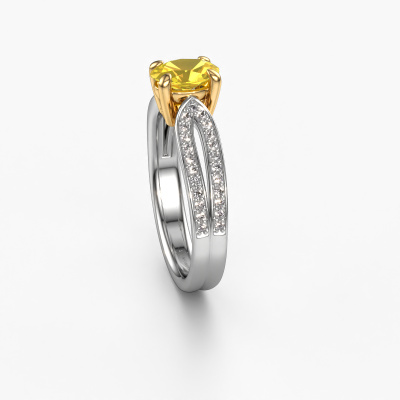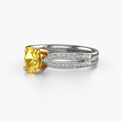 The ring shown above is called the Antonia ovl 2. We call this type of ring a pavé solitaire ring because it has one centre gemstone and a band that is also pave set with gemstones. The 14 Carat white gold engagement ring is set with a oval 7x5 mm yellow sapphire centre stone and the band is pave set with diamond gemstones. Each jewel is unique in every way! Simply customize to your liking,This contemporary white gold pavé solitaire engagement ring has an exquisite oval yellow sapphire centre stone. To further accentuate the centre stone, the band is fully set with more diamonds. Its open prong setting allows light to strike the yellow sapphire from various angles and this adds sparkle to your yellow sapphire ring. The photo shown above depicts the goldsmith's carefully handcrafted details of the ring. The high positioning of the centre stone is truly eye-catching. The perfect engagement ring for the crown jewel of your life! By using a combination of the latest modern techniques, combined with ancient crafting, we can make all our engagement rings in our own studio. Each jewel is made to order. This is advantageous because we can offer you a price you won't find anywhere else.Our team adds new designs to our online collection daily. Our designers and goldsmiths work together in creating the best design. We strive to offer a diverse collection of jewels. Perhaps you have a specific jewel design in mind. One you came across somewhere. Please contact us for a free consultation. We will make you an offer, based on a fair price/ quality ratio, that will baffle you.To make it easier for you, we offer a 30 day return policy. Check our terms and conditions.