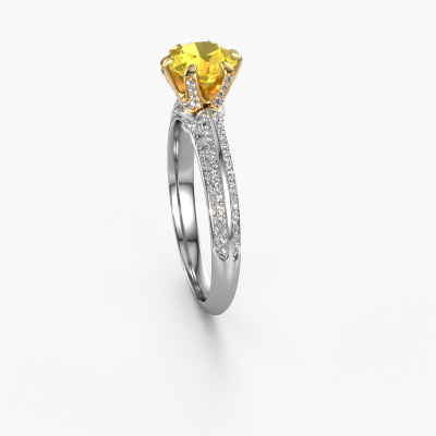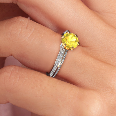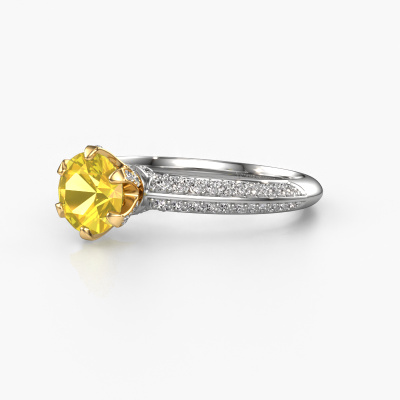 The ring shown above is called the Abby. We call this type of ring a pavé solitaire ring because it has one centre gemstone and a band that is also pave set with gemstones. The 14 Carat white gold engagement ring is set with a round 6.5 mm yellow sapphire centre stone and the band is pave set with diamond gemstones. Each jewel is made just for you by our master goldsmiths in our own studio.This exclusive white gold pavé solitaire engagement ring has an exquisite round yellow sapphire centre stone. To further accentuate the centre stone, the band is fully set with more diamonds. Its open prong setting allows light to strike the yellow sapphire from various angles and this adds sparkle to your yellow sapphire ring. The photo shown above depicts the goldsmith's carefully handcrafted details of the ring. The high positioning of the centre stone is truly eye-catching. The perfect engagement ring for the crown jewel of your life! Are you on a budget? Please feel free to contact us, so we can go discuss your options. We offer our engagement rings at guaranteed best price, because we make them to order. You won't find such a price anywhere else!Our team adds new designs to our online collection daily. Our designers and goldsmiths work together in creating the best design. We strive to offer a diverse collection of jewels. Perhaps you have a specific jewel design in mind. One you came across somewhere. Please contact us for a free consultation. We will make you an offer, based on a fair price/ quality ratio, that will baffle you.To make it easier for you, we offer a 30 day return policy. Check our terms and conditions.