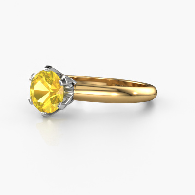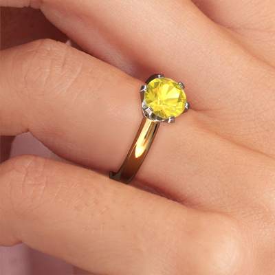 The ring shown above is called the Tiffy 1, we call this a solitaire ring because it contains a single gemstone. The engagement ring is made in 14 Carat gold and has a round yellow sapphire of 7 mm. The cool thing about our configurator is that you can compile your own piece of jewellery, into a completely personalized one. This solitaire ring is crafted in the precious metals gold with white gold, but of course you are free to pick your own colours. Each piece of jewellery is made just for you, with attention to detail and design.The solitaire ring is a special type of engagement ring. Its open prong setting allows light to strike the gemstone from various angles. This classic engagement ring is a stunning eye-catcher because of the high positioning of the gemstone. In order for you to commemorate your proposal with a unique ring, we carefully adorn this solitaire ring by hand. The love of your life deserves nothing but the best. By using our modern techniques, we can design and customize the finest quality jewels with the utmost care for you. Our engagement rings are always priced 30 percent lower than other jewellers. We make engagement rings to order so we don't have to maintain a large stock. If you have a certain budget, we are more than happy to advice you accordingly.Our designers and goldsmiths work together each day, creating new jewels. Perhaps you have found a nice classic engagement ring somewhere, which can be used to customize your unique ring. Please feel free to contact us. We will make you an offer, based on a fair price/ quality ratio, which will amaze you.To make it easier for you, we offer a 30 day return policy. Check our terms and conditions.