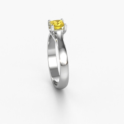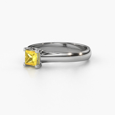 The ring shown above is called the Mia Square, we call this a solitaire ring because it contains a single gemstone. The engagement ring is made in platinum and has a princess yellow sapphire of 4 mm. The cool thing about our configurator is that you can compile your own piece of jewellery, into a completely personalized one. This solitaire ring is crafted in the precious metals platinum with platinum, but of course you are free to pick your own colours. Each piece of jewellery is made by a team of passionate goldsmiths and jewel designers. This will make your crown jewel truly eye-catching.The solitaire ring is a special type of engagement ring. Its open prong setting allows light to strike the gemstone from various angles. This modern engagement ring is a stunning eye-catcher because of the high positioning of the gemstone. In order for you to commemorate your proposal with a unique ring, we carefully adorn this solitaire ring by hand. The love of your life deserves nothing but the best. By using our modern techniques, we can design and customize the finest quality jewels with the utmost care for you. Our engagement rings are always priced 30 percent lower than other jewellers. We make engagement rings to order so we don't have to maintain a large stock. If you have a certain budget, we are more than happy to advice you accordingly.Have you found a specific engagement ring somewhere which you would like to give to your loved one? Please feel free to express your wishes to our jewel designers because we would be honoured to turn your design into a modern engagement ring. You can follow the development of your ring design because we use 3D drawings. This gives you a realistic preview of how your design will look. You can also preorder a dummy. A dummy is a plastic ring, which can be shaped according your ring design. You can try it on and check if its width and size are suitable for you. We will gladly send you a non-binding offer, based on a fair price/ quality ratio. It will amaze you, considering the quality of the ring and gemstones.To make it easier for you, we offer a 30 day return policy. Check our terms and conditions.