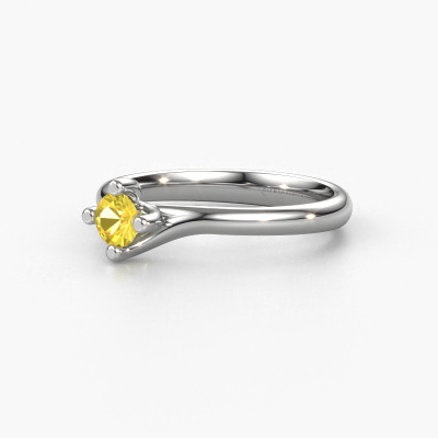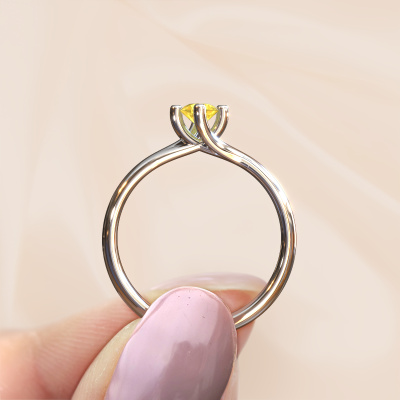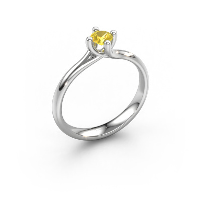 In your eyes, no one else compares to her. She is one in a million, unlike anyone else and pure? These qualities are emphasized perfectly by our modern white gold solitaire yellow sapphire ring. This yellow sapphire is carefully selected by our keen artisan goldsmiths. It equals the unique qualities of the love of your life. There is no better way to memorialize your proposal than this symbol of true love. The ring shown above is called the Dewi Round, we call this a solitaire ring because it contains a single gemstone. The engagement ring is made in 14 Carat white gold and has a round yellow sapphire of 4 mm. Each piece of jewellery is made to shine bright around your finger. Each jewel is hand made with love by our goldsmiths.After receiving your order, our goldsmiths will passionately start the creative process of making your engagement ring in our own studio. Because we don't have a big stockpile, these costs will not be passed on to you. Our pricing is proof of that! We offer top quality jewels at lowest price, guaranteed.Different styles of new rings are made daily by our team. Perhaps you have found a solitaire engagement ring somewhere. One you would like to give to your loved one. Please feel free to share your thoughts and design with our jewel designers. We would love to turn your design into a modern engagement ring. You can follow the development of your ring design because we use very detailed 3D drawings. On top of that, you can order a dummy of the design. A dummy is a plastic ring, which can be shaped according your ring design. You can try it on and check if the engagement ring is up to standard. We will gladly send you a non-binding offer, based on a fair price/ quality ratio. The offer will baffle you, considering the quality of the ring and gemstones.To make it easier for you, we offer a 30 day return policy. Check our terms and conditions.