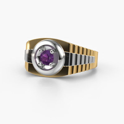 Everyone knows the design of this well-known watch brand. With two colours of gold links, this solid 14 Carat gold Edward men's ring, is perfectly suited for trendy, successful men. A man who wants to dress to impress with a striking men's ring with 4.7 mm amethyst. Show them what you are made of!How do you like this exclusive gold men's ring? Simply customize this Edward men's ring, using our online tool. Subsequently, your personal daring Edward men's ring will be made by hand by our goldsmiths. Precious metals and gemstones can be customized to your liking. Do you have specific preferences which are unavailable in our online tool? Please feel free to contact us. We will customize your personal exclusive men's ring to your liking.Our talented designers add new designs to our online collection daily. Together they create a diverse collection of the finest jewellery. If you prefer to make a ring according your own design, please feel free to request a quote. We will make you an amazing offer, based on quality and price.Because we design and deliver our own rings, we can offer you a ring at a price you won't find anywhere else. A ring is made to order, which helps prevent excess supplies, so we can make you a great price offer. We understand it feels risky, buying your ring online, but we will gladly assist in the designing process, taking your budget into consideration.To make it easier for you, we offer a 30 day return policy. Check our terms and conditions.