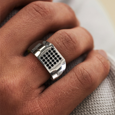 Are you looking for a modern platinum men's ring that is slightly different? Then our square platinum black diamond set Job men's ring is the perfect ring for you! This ring, as shown here, is made of platinum but feel free to customize to your liking. Show them what you are all about with this platinum black diamonds Job men's ring, a ring for ambitious men. As soon as you finished designing your Job men's ring with our online tool, our goldsmiths will start their creative process of making your ring. This will be done with passion and care, according ancient crafting. On top of that, our jewels are made of eco-friendly materials. Simply customize online with our online tool, if you want any changes made. If you want specific changes made to your Job men's ring, that are unavailable in our online tool, please feel free to contact our expert designers.Our team of talented, passionate designers add new ring designs to our online collection daily. Our objective in doing so, is to be able to offer you a wide variety of jewels. Please feel free to request a quote if you have specific wishes for your ring. We guarantee to make you an offer you can't refuse.Because we design and deliver our own rings, we can offer you a ring at a price you won't find anywhere else. A ring is made to order, which helps prevent excess supplies, so we can make you a great price offer. We understand it feels risky, buying your ring online, but we will gladly assist in the designing process, taking your budget into consideration.To make it easier for you, we offer a 30 day return policy. Check our terms and conditions.