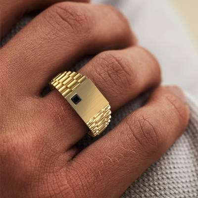 Everyone knows the design of this well-known watch brand. With two colours of gold links, this solid 14 Carat gold Pelle men's ring, is perfectly suited for trendy, successful men. A man who wants to dress to impress with a striking men's ring with 0.204 crt black diamond. Show them what you are made of!The best part of this royal men's ring is that you can customize it to your own liking. Your style, your choice, your men's ring. On top of that, your luxury gold men's ring will be made by hand with eco-friendly materials! Please feel free to easily customize the ring, using our online tool. Of course, you can always contact us. We will gladly help you compiling your luxury men's ring. Is there a design you like, but you would like to customize it with a gemstone we do not offer on our website, then please contact us. We're happy to tell you about the possibilities.Our team of talented, passionate designers add new ring designs to our online collection daily. Our objective in doing so, is to be able to offer you a wide variety of jewels. Please feel free to request a quote if you have specific wishes for your ring. We guarantee to make you an offer you can't refuse.After receiving your order, our goldsmiths will start the creative process of making your Pelle ring. We don't keep stock. This is advantageous because these costs will not be passed on to you. Therefore, we can offer jewellery at exceptionally low prices.To make it easier for you, we offer a 30 day return policy. Check our terms and conditions.