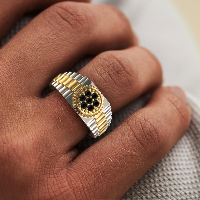 Everyone knows the design of this well-known watch brand. With two colours of white gold links, this solid 14 Carat white gold Nout men's ring, is perfectly suited for trendy, successful men. A man who wants to dress to impress with a striking men's ring with 0.252 crt black diamond. Show them what you are made of!Our goldsmiths passionately create your customized men's ring to your liking with the utmost care. The white gold men's ring, as shown here, can be customized using our online tool. Feel free to ask our jewel designers for assistance if you want changes made which are unavailable in our online tool. We are happy to answer your questions.New jewellery designs are added to our online collection daily. Our team of passionate designers strive to create extraordinary and diverse designs. Have you seen a ring you like? Please feel free to contact us. Based on a good price/ quality ratio, we will make you an offer you can't refuse!By using our modern techniques, we can design and customize the finest quality jewels with the utmost care for you. Our rings are always priced 30 percent lower than other jewellers. We make rings to order, so we don't have to maintain a large stock. If you have a certain budget, we are more than happy to advice you accordingly.To make it easier for you, we offer a 30 day return policy. Check our terms and conditions.
