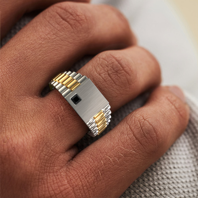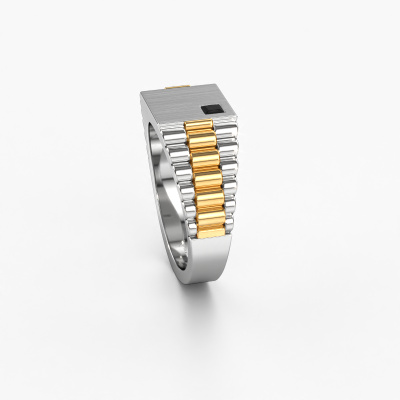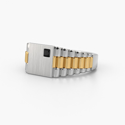 Everyone knows the design of this well-known watch brand. With two colours of white gold links, this solid 14 Carat white gold Pelle men's ring, is perfectly suited for trendy, successful men. A man who wants to dress to impress with a striking men's ring with 0.204 crt black diamond. Show them what you are made of!The best part of this royal men's ring is that you can customize it to your own liking. Your style, your choice, your men's ring. On top of that, your luxury white gold men's ring will be made by hand with eco-friendly materials! Please feel free to easily customize the ring, using our online tool. Of course, you can always contact us. We will gladly help you compiling your luxury men's ring. Is there a design you like, but you would like to customize it with a gemstone we do not offer on our website, then please contact us. We're happy to tell you about the possibilities.Our team of talented, passionate designers add new ring designs to our online collection daily. Our objective in doing so, is to be able to offer you a wide variety of jewels. Please feel free to request a quote if you have specific wishes for your ring. We guarantee to make you an offer you can't refuse.After receiving your order, our goldsmiths will start the creative process of making your Pelle ring. We don't keep stock. This is advantageous because these costs will not be passed on to you. Therefore, we can offer jewellery at exceptionally low prices.To make it easier for you, we offer a 30 day return policy. Check our terms and conditions.