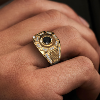 Are you looking for a modern gold men's ring that is slightly different? Then our heavy gold black diamond set Enzo men's ring is the perfect ring for you! This ring, as shown here, is made of gold but feel free to customize to your liking. Show them what you are all about with this gold black diamonds Enzo men's ring, a ring for ambitious men. Customize your own special Enzo men's ring, which will then be created by our goldsmiths with great passion. Do you prefer a different option than is shown here in the gold Enzo men's ring? Then our online tools offers various options. Feel free to ask us for help if you are unable to succeed. We are happy to answer your questions!Our team of talented, passionate designers add new ring designs to our online collection daily. Our objective in doing so, is to be able to offer you a wide variety of jewels. Please feel free to request a quote if you have specific wishes for your ring. We guarantee to make you an offer you can't refuse.After receiving your order, our goldsmiths will start the creative process of making your Enzo ring. We don't keep stock. This is advantageous because these costs will not be passed on to you. Therefore, we can offer jewellery at exceptionally low prices.To make it easier for you, we offer a 30 day return policy. Check our terms and conditions.