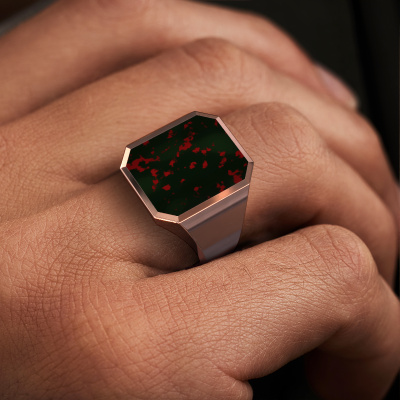 The solid Lars 5 signet ring with octagon bloodstone stone top, as shown above, is filled with tradition. Customary, the signet ring was passed down from father to son. Start your own tradition with this solid rose gold signet ring. We are also more than happy to engrave your ring with a monogram or family crest. Please check our database for further inquiries and options. You can find the departments of our education centre at the bottom of this page. Start a new tradition with the chic rose gold Lars 5 signet ring. The luxury Lars 5 signet ring, as shown here, can be customized to your liking. Our online tool offers many different options but please feel free to contact us if you want changes made to your Lars 5 signet ring, which are unavailable in our online tool.New jewellery designs are added to our online collection daily. Our team of passionate designers strive to create extraordinary and diverse designs. Have you seen a ring you like? Please feel free to contact us. Based on a good price/ quality ratio, we will make you an offer you can't refuse!Because we design and deliver our own rings, we can offer you a ring at a price you won't find anywhere else. A ring is made to order, which helps prevent excess supplies, so we can make you a great price offer. We understand it feels risky, buying your ring online, but we will gladly assist in the designing process, taking your budget into consideration.To make it easier for you, we offer a 30 day return policy. Check our terms and conditions.