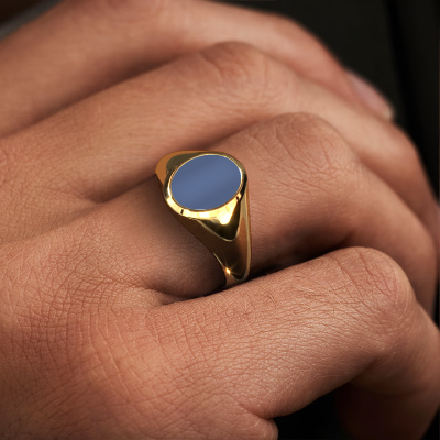 The solid Herman 1 pinky ring with oval shape blue sardonyx stone top, as shown above, is filled with tradition. Customary, the pinky ring was passed down from father to son. Start your own tradition with this solid gold pinky ring. We are also more than happy to engrave your ring with a monogram or family crest. Please check our database for further inquiries and options. You can find the departments of our education centre at the bottom of this page. Start a new tradition with the traditional gold Herman 1 pinky ring. As soon as you finished designing your Herman 1 signet ring with our online tool, our goldsmiths will start their creative process of making your ring. This will be done with passion and care, according ancient crafting. On top of that, our jewels are made of eco-friendly materials. Simply customize online with our online tool, if you want any changes made. If you want specific changes made to your Herman 1 signet ring, that are unavailable in our online tool, please feel free to contact our expert designers.