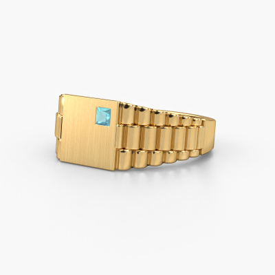 Everyone knows the design of this well-known watch brand. With two colours of gold links, this solid 14 Carat gold Pelle men's ring, is perfectly suited for trendy, successful men. A man who wants to dress to impress with a striking men's ring with 3 mm blue topaz. Show them what you are made of!The best part of this royal men's ring is that you can customize it to your own liking. Your style, your choice, your men's ring. On top of that, your luxury gold men's ring will be made by hand with eco-friendly materials! Please feel free to easily customize the ring, using our online tool. Of course, you can always contact us. We will gladly help you compiling your luxury men's ring. Is there a design you like, but you would like to customize it with a gemstone we do not offer on our website, then please contact us. We're happy to tell you about the possibilities.Our team of talented, passionate designers add new ring designs to our online collection daily. Our objective in doing so, is to be able to offer you a wide variety of jewels. Please feel free to request a quote if you have specific wishes for your ring. We guarantee to make you an offer you can't refuse.After receiving your order, our goldsmiths will start the creative process of making your Pelle ring. We don't keep stock. This is advantageous because these costs will not be passed on to you. Therefore, we can offer jewellery at exceptionally low prices.To make it easier for you, we offer a 30 day return policy. Check our terms and conditions.
