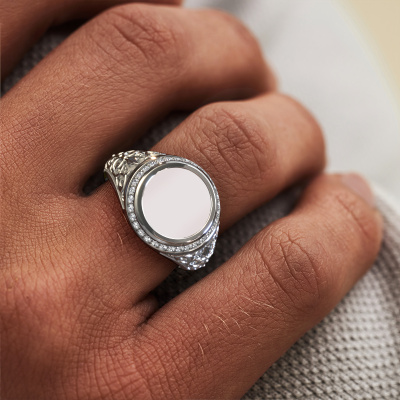Dress to impress with this round Moor 2 signet ring, because with the right ring you make a strong personal statement. This Moor 2 daring signet ring is shown in platinum. If this doesn't suit your style, feel free to customize the precious metal to your liking. After all, you want a signet ring that matches your style. A ring that truly suits you. One saying: This is who I am!How do you like this contemporary platinum signet ring? Simply customize this Moor 2 signet ring, using our online tool. Subsequently, your personal daring Moor 2 signet ring will be made by hand by our goldsmiths. Precious metals and gemstones can be customized to your liking. Do you have specific preferences which are unavailable in our online tool? Please feel free to contact us. We will customize your personal contemporary signet ring to your liking.Our team of talented, passionate designers add new ring designs to our online collection daily. Our objective in doing so, is to be able to offer you a wide variety of jewels. Please feel free to request a quote if you have specific wishes for your ring. We guarantee to make you an offer you can't refuse.By using a combination of the latest modern techniques, combined with ancient crafting, we can make all our rings in our own studio. Each jewel is made to order. This is advantageous because we can offer you a price you won't find anywhere else.To make it easier for you, we offer a 30 day return policy. Check our terms and conditions.