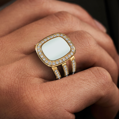 The wide Tijn signet ring with rectangle antique green sardonyx stone top, as shown above, is filled with tradition. Customary, the signet ring was passed down from father to son. Start your own tradition with this wide gold signet ring. We are also more than happy to engrave your ring with a monogram or family crest. Please check our database for further inquiries and options. You can find the departments of our education centre at the bottom of this page. Start a new tradition with the exclusive gold Tijn signet ring. The special Tijn signet ring, as shown here, can be customized to your liking. Our online tool offers many different options but please feel free to contact us if you want changes made to your Tijn signet ring, which are unavailable in our online tool.New jewellery designs are added to our online collection daily. Our team of passionate designers strive to create extraordinary and diverse designs. Have you seen a ring you like? Please feel free to contact us. Based on a good price/ quality ratio, we will make you an offer you can't refuse!After receiving your order, our goldsmiths will start the creative process of making your Tijn ring. We don't keep stock. This is advantageous because these costs will not be passed on to you. Therefore, we can offer jewellery at exceptionally low prices.To make it easier for you, we offer a 30 day return policy. Check our terms and conditions.