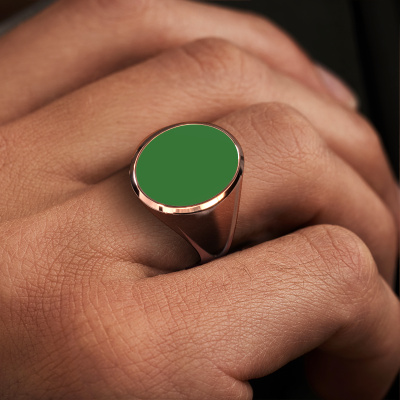 The heavy Herman 6 signet ring with oval shape green enamel stone top, as shown above, is filled with tradition. Customary, the signet ring was passed down from father to son. Start your own tradition with this heavy rose gold signet ring. We are also more than happy to engrave your ring with a monogram or family crest. Please check our database for further inquiries and options. You can find the departments of our education centre at the bottom of this page. Start a new tradition with the modern rose gold Herman 6 signet ring. How do you like this modern rose gold signet ring? Simply customize this Herman 6 signet ring, using our online tool. Subsequently, your personal cool Herman 6 signet ring will be made by hand by our goldsmiths. Precious metals and gemstones can be customized to your liking. Do you have specific preferences which are unavailable in our online tool? Please feel free to contact us. We will customize your personal modern signet ring to your liking.Our team of talented, passionate designers add new ring designs to our online collection daily. Our objective in doing so, is to be able to offer you a wide variety of jewels. Please feel free to request a quote if you have specific wishes for your ring. We guarantee to make you an offer you can't refuse.Because we design and deliver our own rings, we can offer you a ring at a price you won't find anywhere else. A ring is made to order, which helps prevent excess supplies, so we can make you a great price offer. We understand it feels risky, buying your ring online, but we will gladly assist in the designing process, taking your budget into consideration.To make it easier for you, we offer a 30 day return policy. Check our terms and conditions.