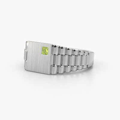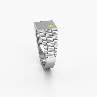 Everyone knows the design of this well-known watch brand. With two colours of platinum links, this solid platinum Pelle men's ring, is perfectly suited for trendy, successful men. A man who wants to dress to impress with a striking men's ring with 3 mm peridot. Show them what you are made of!The best part of this royal men's ring is that you can customize it to your own liking. Your style, your choice, your men's ring. On top of that, your luxury platinum men's ring will be made by hand with eco-friendly materials! Please feel free to easily customize the ring, using our online tool. Of course, you can always contact us. We will gladly help you compiling your luxury men's ring. Is there a design you like, but you would like to customize it with a gemstone we do not offer on our website, then please contact us. We're happy to tell you about the possibilities.Our team of talented, passionate designers add new ring designs to our online collection daily. Our objective in doing so, is to be able to offer you a wide variety of jewels. Please feel free to request a quote if you have specific wishes for your ring. We guarantee to make you an offer you can't refuse.After receiving your order, our goldsmiths will start the creative process of making your Pelle ring. We don't keep stock. This is advantageous because these costs will not be passed on to you. Therefore, we can offer jewellery at exceptionally low prices.To make it easier for you, we offer a 30 day return policy. Check our terms and conditions.