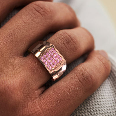 Are you looking for a modern rose gold men's ring that is slightly different? Then our square rose gold pink sapphire set Job men's ring is the perfect ring for you! This ring, as shown here, is made of rose gold but feel free to customize to your liking. Show them what you are all about with this rose gold pink sapphire Job men's ring, a ring for ambitious men. As soon as you finished designing your Job men's ring with our online tool, our goldsmiths will start their creative process of making your ring. This will be done with passion and care, according ancient crafting. On top of that, our jewels are made of eco-friendly materials. Simply customize online with our online tool, if you want any changes made. If you want specific changes made to your Job men's ring, that are unavailable in our online tool, please feel free to contact our expert designers.Our team of talented, passionate designers add new ring designs to our online collection daily. Our objective in doing so, is to be able to offer you a wide variety of jewels. Please feel free to request a quote if you have specific wishes for your ring. We guarantee to make you an offer you can't refuse.Because we design and deliver our own rings, we can offer you a ring at a price you won't find anywhere else. A ring is made to order, which helps prevent excess supplies, so we can make you a great price offer. We understand it feels risky, buying your ring online, but we will gladly assist in the designing process, taking your budget into consideration.To make it easier for you, we offer a 30 day return policy. Check our terms and conditions.