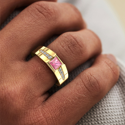 Are you looking for a modern gold pinky ring that is slightly different? Then our square gold pink sapphire set Simon pinky ring is the perfect ring for you! This ring, as shown here, is made of gold but feel free to customize to your liking. Show them what you are all about with this gold pink sapphire Simon pinky ring, a ring for ambitious men. How do you like this modern gold men's ring? Simply customize this Simon men's ring, using our online tool. Subsequently, your personal luxury Simon men's ring will be made by hand by our goldsmiths. Precious metals and gemstones can be customized to your liking. Do you have specific preferences which are unavailable in our online tool? Please feel free to contact us. We will customize your personal modern men's ring to your liking.Our talented designers add new designs to our online collection daily. Together they create a diverse collection of the finest jewellery. If you prefer to make a ring according your own design, please feel free to request a quote. We will make you an amazing offer, based on quality and price.By using a combination of the latest modern techniques, combined with ancient crafting, we can make all our rings in our own studio. Each jewel is made to order. This is advantageous because we can offer you a price you won't find anywhere else.To make it easier for you, we offer a 30 day return policy. Check our terms and conditions.