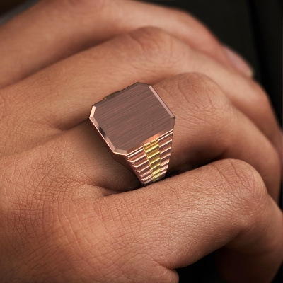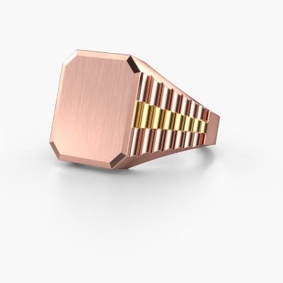 Everyone knows the design of this well-known watch brand. With two colours of rose gold links, this 2 Colours 14 Carat rose gold Erik 3 signet ring, is perfectly suited for trendy, successful men. A man who wants to dress to impress with a striking signet ring. Show them what you are made of!As soon as you finished designing your Erik 3 signet ring with our online tool, our goldsmiths will start their creative process of making your ring. This will be done with passion and care, according ancient crafting. On top of that, our jewels are made of eco-friendly materials. Simply customize online with our online tool, if you want any changes made. If you want specific changes made to your Erik 3 signet ring, that are unavailable in our online tool, please feel free to contact our expert designers.New jewellery designs are added to our online collection daily. Our team of passionate designers strive to create extraordinary and diverse designs. Have you seen a ring you like? Please feel free to contact us. Based on a good price/ quality ratio, we will make you an offer you can't refuse!Are you on a budget? Please feel free to contact us, so we can go discuss your options. We offer our rings at guaranteed best price, because we make them to order. You won't find such a price anywhere else!To make it easier for you, we offer a 30 day return policy. Check our terms and conditions.