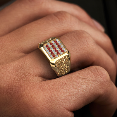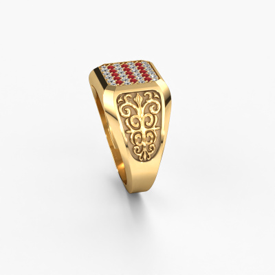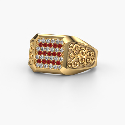 Are you looking for a design gold men's ring that is slightly different? Then our flat gold ruby set Amir men's ring is the perfect ring for you! This ring, as shown here, is made of gold but feel free to customize to your liking. Show them what you are all about with this gold ruby Amir men's ring, a ring for ambitious men. Our goldsmiths passionately create your customized men's ring to your liking with the utmost care. The gold men's ring, as shown here, can be customized using our online tool. Feel free to ask our jewel designers for assistance if you want changes made which are unavailable in our online tool. We are happy to answer your questions.Our team of talented, passionate designers add new ring designs to our online collection daily. Our objective in doing so, is to be able to offer you a wide variety of jewels. Please feel free to request a quote if you have specific wishes for your ring. We guarantee to make you an offer you can't refuse.Because we design and deliver our own rings, we can offer you a ring at a price you won't find anywhere else. A ring is made to order, which helps prevent excess supplies, so we can make you a great price offer. We understand it feels risky, buying your ring online, but we will gladly assist in the designing process, taking your budget into consideration.To make it easier for you, we offer a 30 day return policy. Check our terms and conditions.