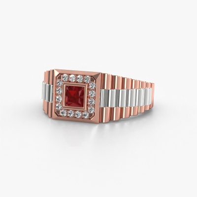 Everyone knows the design of this well-known watch brand. With two colours of rose gold links, this solid 14 Carat rose gold Zilan men's ring, is perfectly suited for trendy, successful men. A man who wants to dress to impress with a striking men's ring with 4 mm ruby. Show them what you are made of!Customize your own special Zilan men's ring, which will then be created by our goldsmiths with great passion. Do you prefer a different option than is shown here in the rose gold Zilan men's ring? Then our online tools offers various options. Feel free to ask us for help if you are unable to succeed. We are happy to answer your questions!Our team of talented, passionate designers add new ring designs to our online collection daily. Our objective in doing so, is to be able to offer you a wide variety of jewels. Please feel free to request a quote if you have specific wishes for your ring. We guarantee to make you an offer you can't refuse.After receiving your order, our goldsmiths will start the creative process of making your Zilan ring. We don't keep stock. This is advantageous because these costs will not be passed on to you. Therefore, we can offer jewellery at exceptionally low prices.To make it easier for you, we offer a 30 day return policy. Check our terms and conditions.
